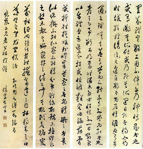 包世臣,1775年生,1855年逝世,安徽泾县人。清代学者、书法家、书学理论家。字慎伯,晚号倦翁、小倦游阁外史。泾县古名安吴,世称“包安吴”。嘉庆二十年举人,曾官江西新渝知县,被劾去官。少工词章。喜兵家言,治经济学。工书法,肆力北魏、兼学“二王”,备得古人神韵。他不但是位书法家,而是一位在书法史上有巨大影响的书法理论家。何绍基称其书名重于江南。著有《安吴四种》,其中《艺舟双楫》下篇为书法理论,提倡北碑,主张转指,对清代中、后期书风的变革影响很大。传世书迹较多。《临书谱》轴,纸本墨迹。草书。凡5行,共57字。纵144.6厘米,横74厘米。天津艺术博物馆藏。包世臣学识渊博,对农政、货币以及文学等均有研究。他为扭转宋代以后帖学的流弊,先后与阮元、康有为同倡碑学,最后致力于篆、隶北碑。一般用笔以侧取势是他书法的主要特点。此碑作品亦不例外。孙过庭《书谱》甚有右军法,包氏临之,大概也属学习“二王”的一种辅助练习吧。通篇点画饱满,但多不能横平竖直,行笔虽纵逸互用,环转连属却不强调,运笔速度较慢,多为一字一停。结体左低右高,横、竖常呈侧斜之势;行距紧凑,作品整体感强,并由于笔画不同侧面的对应使作品得以气势贯通,不觉板滞。由于他用笔过于讲究,放缓速度,随意性也就减弱,造成线条有的地方不够自然,有作做之嫌。
